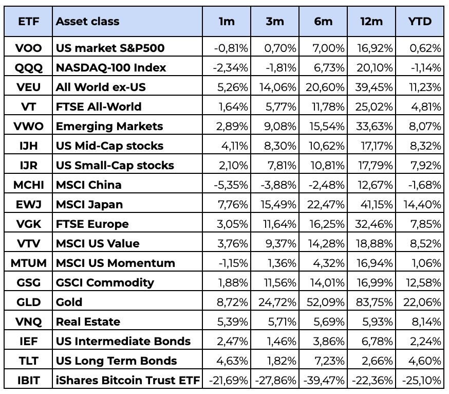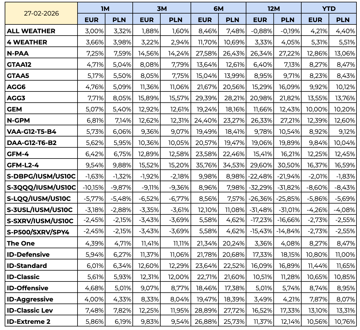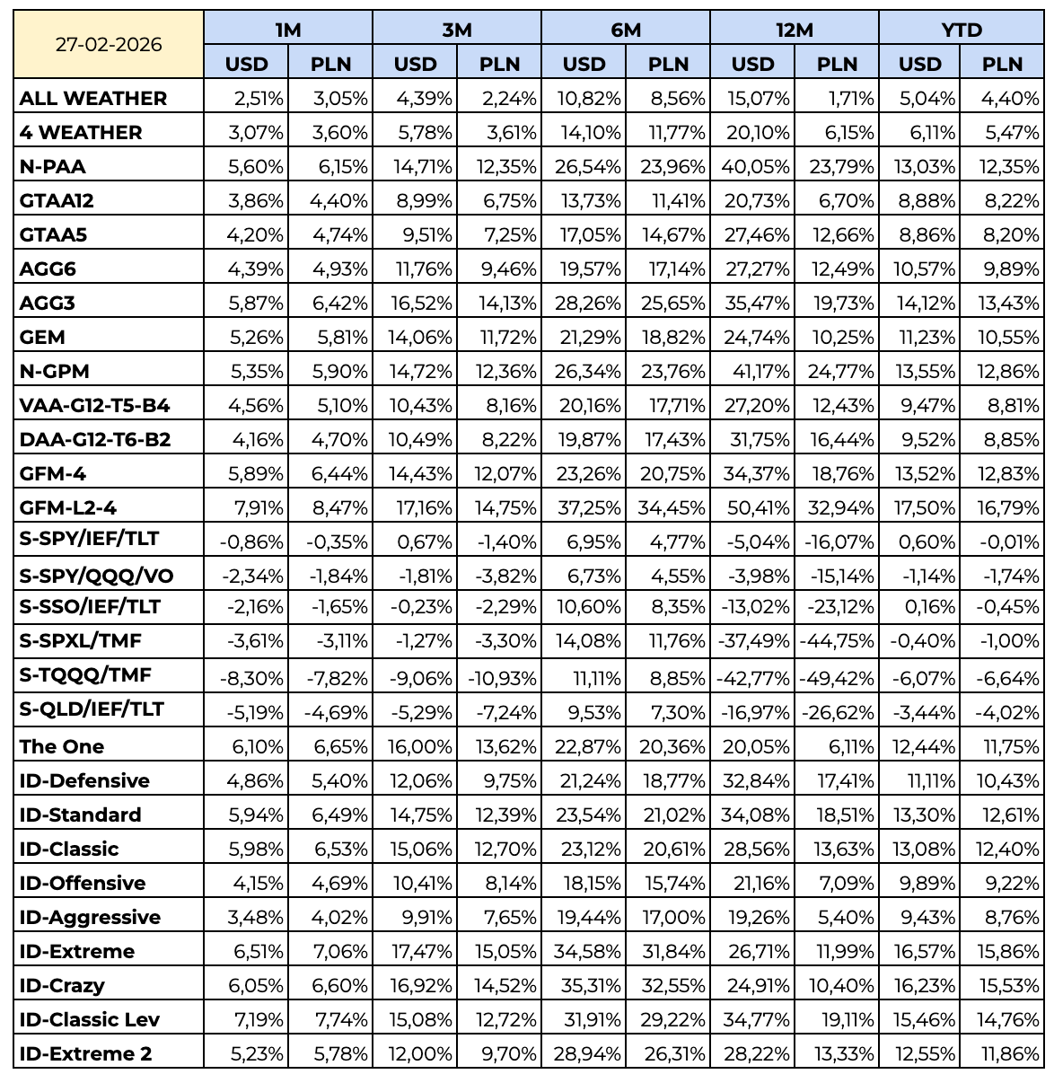 Luty na rynkach finansowych upłynął pod znakiem kontynuacji rotacji kapitału z amerykańskich akcji w kierunku reszty świata i bezpiecznych przystani. Wśród globalnych aktywów dominowało złoto oraz giełdy europejskie i azjatyckie, które radziły sobie zauważalnie lepiej niż tracący na dynamice sektor technologiczny w USA. Te tendencje bezpośrednio przełożyły się na wyniki strategii. Najwyższe stopy zwrotu wypracowały zdywersyfikowane portfele oparte na wielu klasach aktywów, podczas gdy strategie skoncentrowane tylko na USA odnotowały spadki.