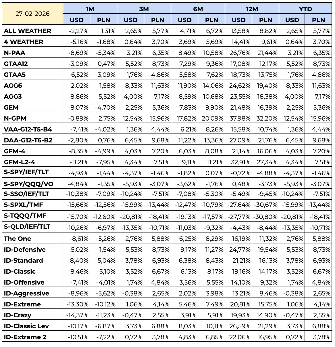 Aktualna alokacja dla poszczególnych strategii dostępna jest w zakładce Portfele w menu głównym. Strategia GFM, DAA, VIX-Model, SlowVIX oraz Portfele ID dostępne są w zakładce Premium. Wyniki strategii pasywnych znajdziesz w zakładce Strategie/Strategie pasywne