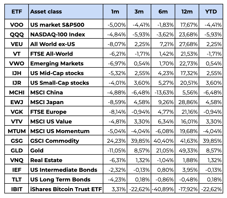 Marzec na rynkach akcji okazał się najtrudniejszym miesiącem od września 2022. S&P 500 stracił 5%, przełamując w dół zarówno 50-dniową, jak i 200-dniową średnią kroczącą – indeks zbliżył się niebezpiecznie blisko terytorium korekty. Nasdaq-100 również odnotował znaczące spadki. Szczególnie mocno ucierpiały spółki półprzewodnikowe.