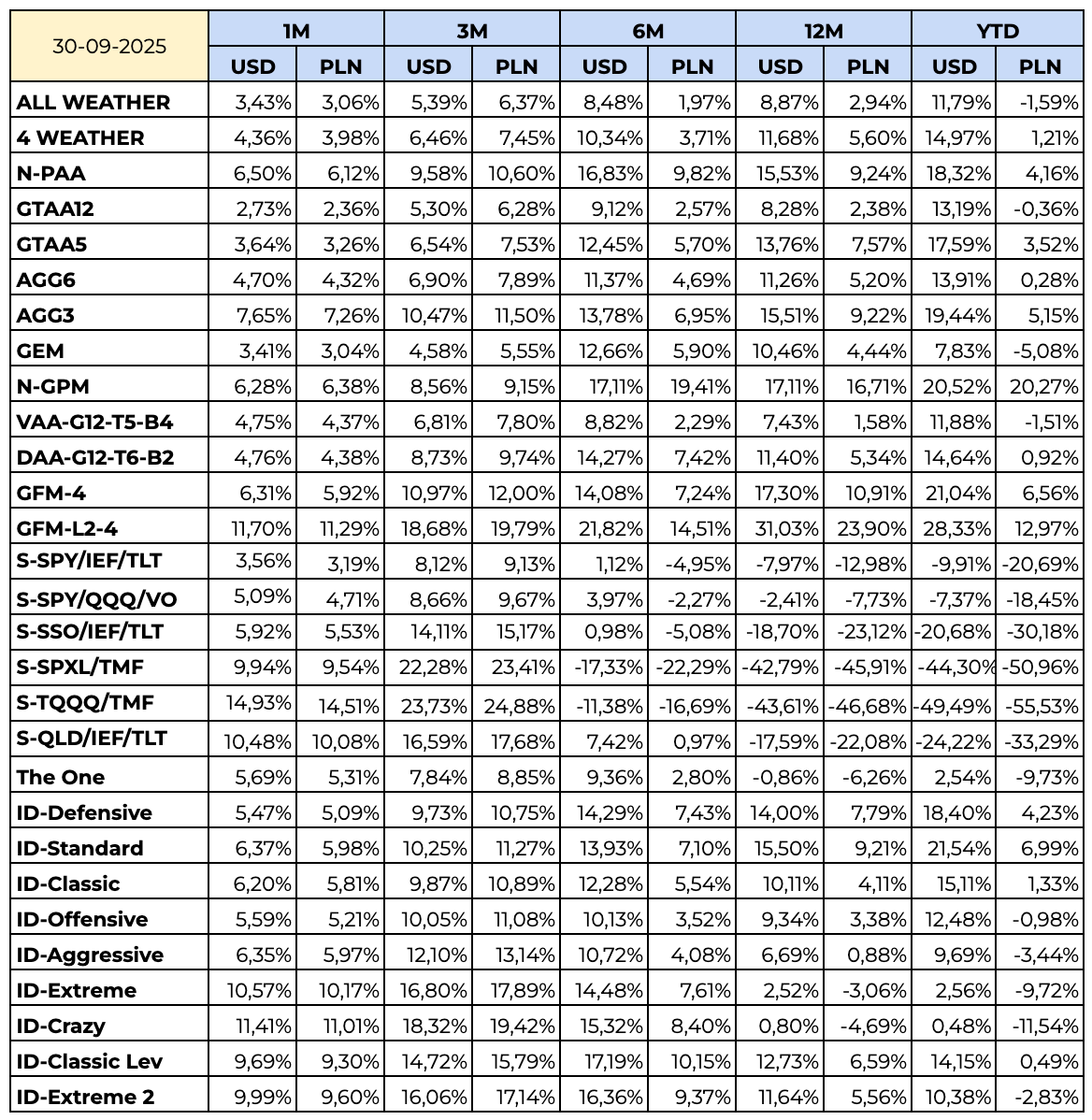 Aktualna alokacja dla poszczególnych strategii dostępna jest w zakładce Portfele w menu głównym. Strategia GFM, DAA, VIX-Model, SlowVIX oraz Portfele ID dostępne są w zakładce Premium. Wyniki strategii pasywnych znajdziesz w zakładce Strategie/Strategie pasywne