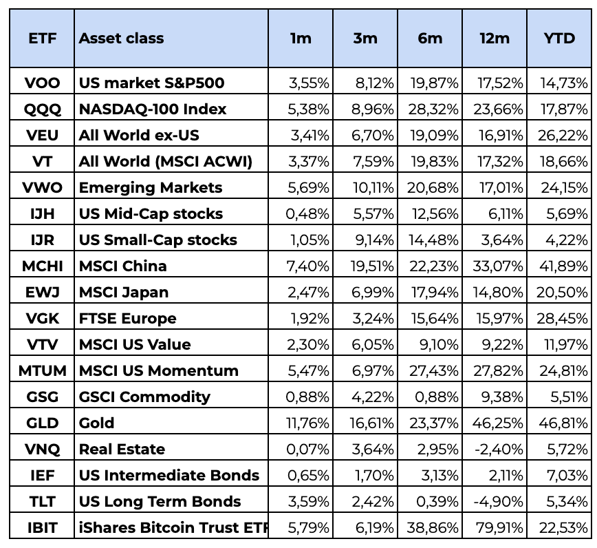 Wyniki za ostatni miesiąc dla wybranych światowych klas aktywów w ujęciu dolarowym.