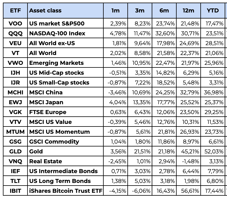 Wyniki za ostatni miesiąc dla wybranych światowych klas aktywów w ujęciu dolarowym.