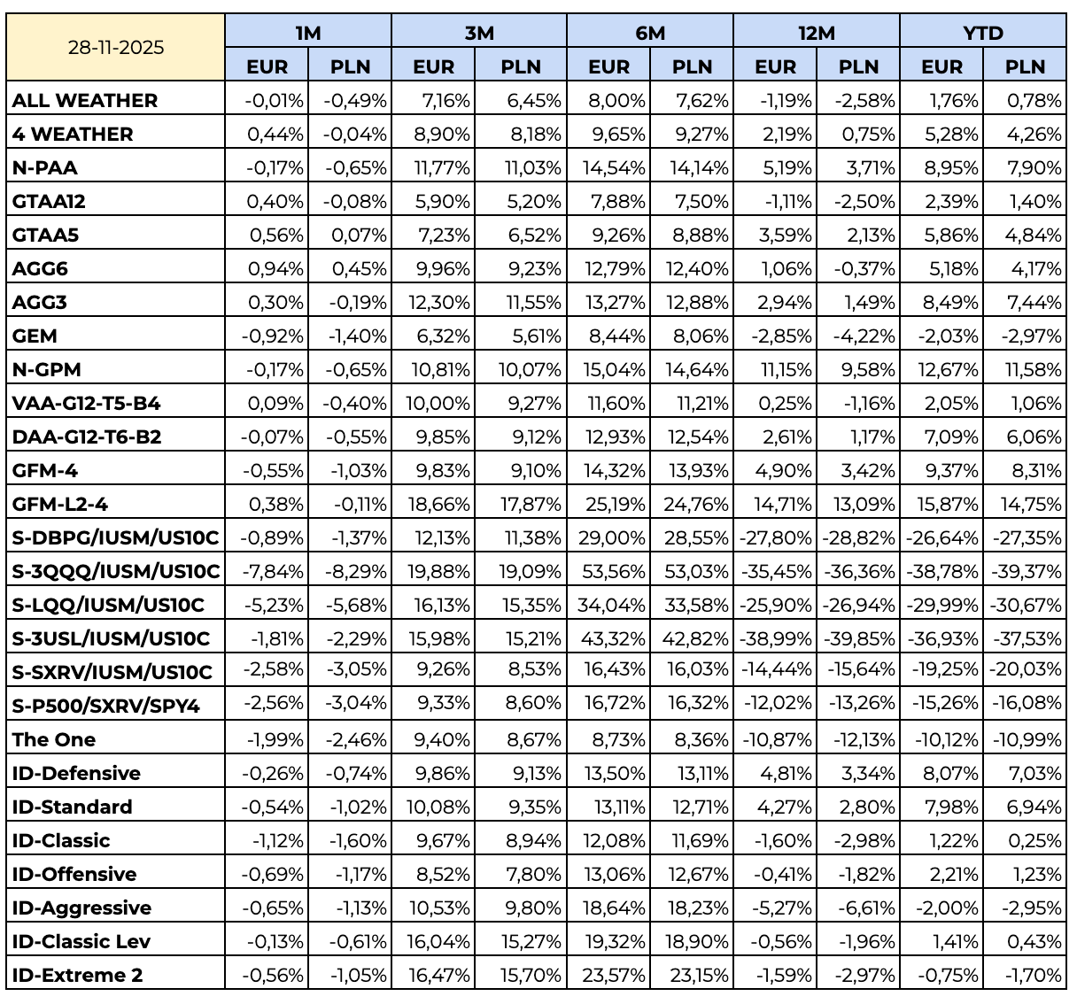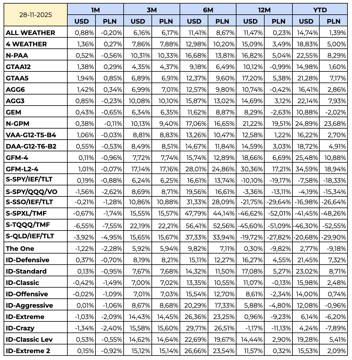 Aktualna alokacja dla poszczególnych strategii dostępna jest w zakładce Portfele w menu głównym. Strategia GFM, DAA, VIX-Model, SlowVIX oraz Portfele ID dostępne są w zakładce Premium. Wyniki strategii pasywnych znajdziesz w zakładce Strategie/Strategie pasywne